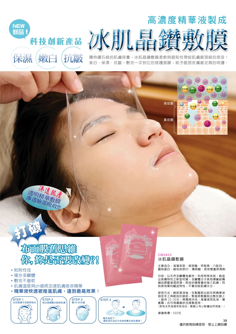 用途:以海藻、玻尿酸、甲殼素做為基底的多醣體敷膜,透氣保溼度高、服貼效果極佳,並添加多種保溼嫩白成分,能迅速